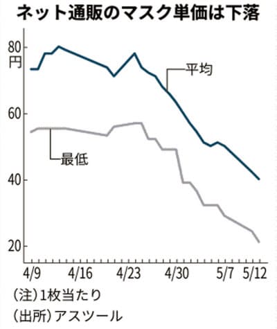 一時期、1枚80円超と高騰していたマスク価格が急落しています。